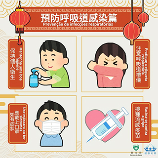 四、預防呼吸道感染:新春期間聚會頻繁,建議居民保持個人衛生,經常用鹼液洗手;咳嗽或打噴嚏時應用紙巾或肘部遮掩口鼻;如有不適應戴上口罩,以減低感染呼吸道傳染病風險。
