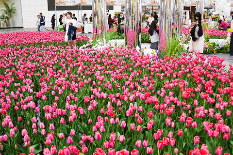 ◎ 三月六日,一片郁金香花田在昆明一商圈亮相,成為街頭亮麗的春日風景,吸引眾多市民前來賞花拍照。(中新社記者 劉冉陽 攝)