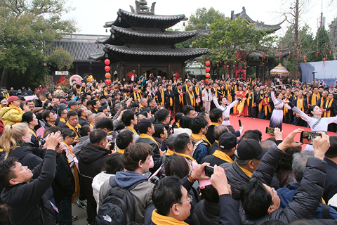 2026丙午「元宵錢王祭」 2026-03-07 03:31:00 ◎ 三月六日,「獻祭舞」環節吸引民眾拍照留念。當日,浙江省非物質文化遺產代表性項目「元宵錢王祭」在杭州西湖畔的錢王祠內舉行,五百餘位錢氏後裔與市民代表齊聚一堂,以傳統禮儀共同祭祀吳越錢王。(中新社記者 曹丹 攝)