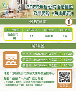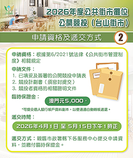 台山街市美食廣場推出競投的七個熟食攤位,可出售各種不同風格的特色美食、懷舊小食等,攤位最細面積11.4平方米,每月租金為1,197澳門元,攤位最大面積19.8平方米,每月租金為2,079澳門元。根據《公共街市管理制度》規定,以公開競投方式招攬攤位承租人,有意競投的市民可按個人意願撰寫競投計劃書。