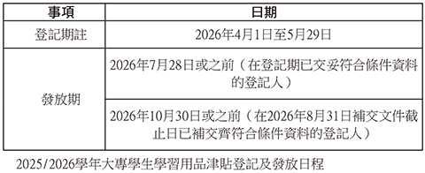 更多詳情,可瀏覽「大專學生學習用品津貼」專頁(https://appl.dsedj.gov.mo/LMSSubsidy/)。