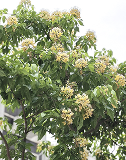 魚木樹的花朵黃白相間,加上綠葉托著花瓣,變成三色花,顯得更美麗!本澳街頭和公園種植了不少魚木樹,由於不是常綠喬木,在其他季節,魚木樹的枝幹都是光秃秃的;快要開花之前,茂密的綠葉掛滿樹,開花後,成為美麗的風景線!