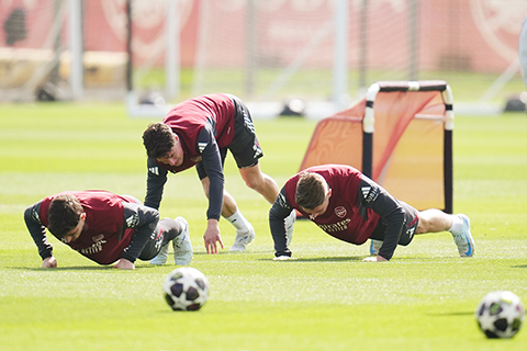 ◎ 夏維斯(左)等阿仙奴主力昨日備戰,今夜三時再鬥上回合歐冠手下敗將士砵亭。(美聯社)